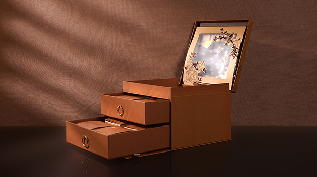 該款中秋禮盒精選灰板外裱高檔的藝術(shù)紙作為主要材質(zhì)。藝術(shù)紙,表面十分光滑,厚度較厚,質(zhì)感細(xì)膩,一般用于高檔禮盒的選材。盒體選用四色印刷工藝,增強(qiáng)了包裝盒的藝術(shù)感染力,Logo選用燙金工藝,搭配了專色印刷的圖案,使整個(gè)盒子顯得非常耀眼。