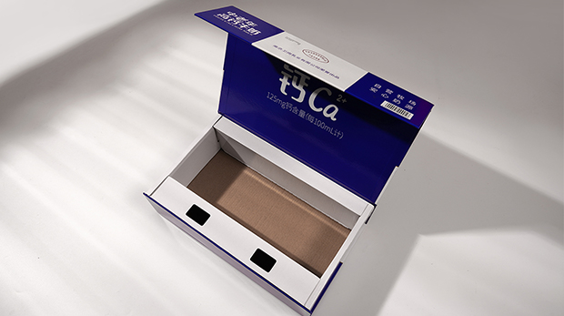 這款包裝盒采用瓦楞紙和銅版紙制成,牢固厚實,外覆亞膜,使包裝盒看起來更有光澤,同時增加了紙盒的使用壽命。包裝盒采用的是常見的翻蓋式折疊包裝。為了方便紙盒的運輸,這款包裝盒的盒身采用了可折疊的結構樣式,同時內部粘有魔術貼,方便使用時組裝紙盒。
